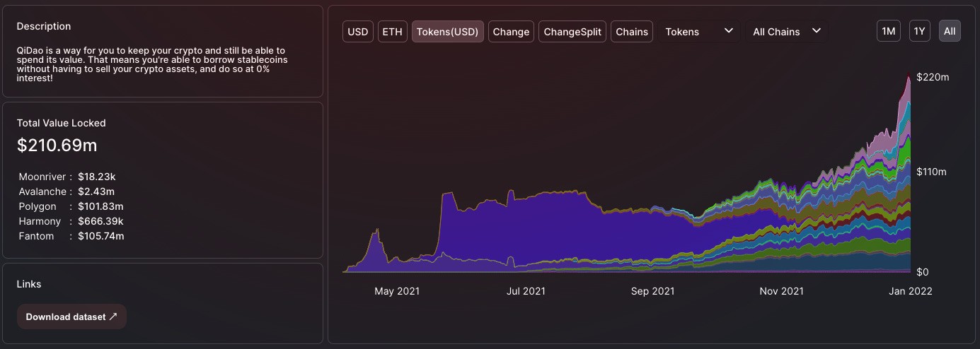MAI’s value is backed by assets in user accounts, known as vaults. Investors deposit assets to the QiDao platform and mint MAI tokens. This debt position is over-collateralized (as is typical in DeFi).