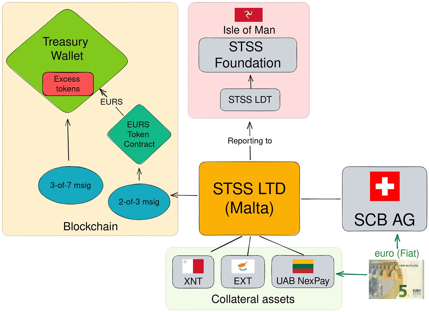 Stasis claims that EURS is backed 1:1 by cash reserves and sovereign and corporate bonds. Our verification shows that assets are held with the following entities: EXT LTD (Cyprus), XNT LDT (Malta), and UAB NexPay (Lithuania).
