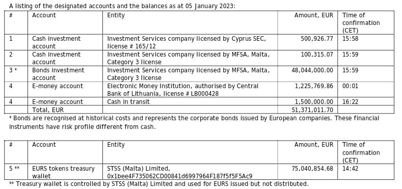 At the time we began our research, the latest verified report was dated January 5th, 2023. On that date there were 50.9M EURS in circulation, roughly 48M backed by holdings in the MFSA bond investment account. This put the overall collateralization at just over 100% (according to the accounting method that recognizes the face value of the bond holdings). The following image shows the breakdown as of January 5th: