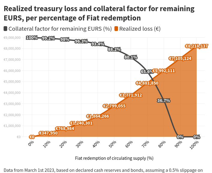 A FIAT redemption of over 25% would be catastrophic for EURS holders as realized losses would amount to €1M, far more than current cash reserves.