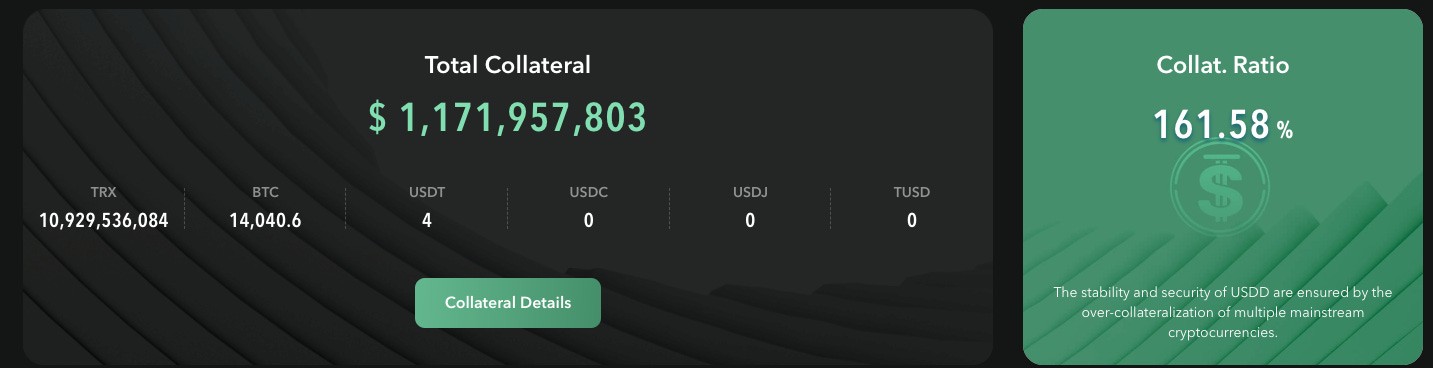 USDD advertizes a high collateralization ratio (CR) on its website. At the time of writing, the CR hovered around 170%. The total collateral is supposedly valued at $1.25B, with $725M USDD in circulation.