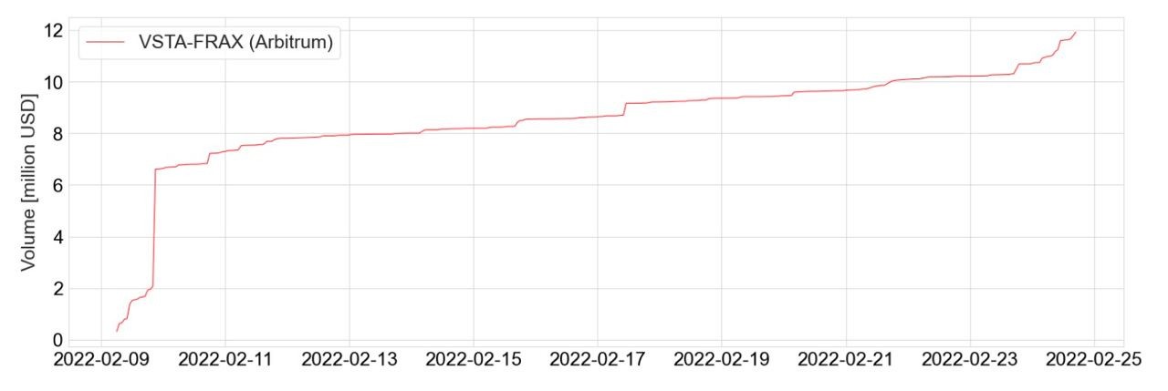 The Curve Factory pool VST/FRAX reached a peak of $30M+- TVL and currently sits at $23M+- TVL. It is one of the deepest liquidity pools on Curve’s Arbitrum implementation. The volume can be seen below this will most likely increase when more collateral types are added. Once this has taken place and VST is fully incentivized, the token should be a fairly high-volume pair for Curve (and thus revenue-generating for veCRV holders). Because Vesta is a lending protocol and VST is generated for leverage loans, it will most likely be sold into the Curve pool for more leverage (similar to MIM) making the VST pairs both high-volume and high-turnover.