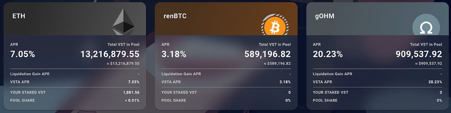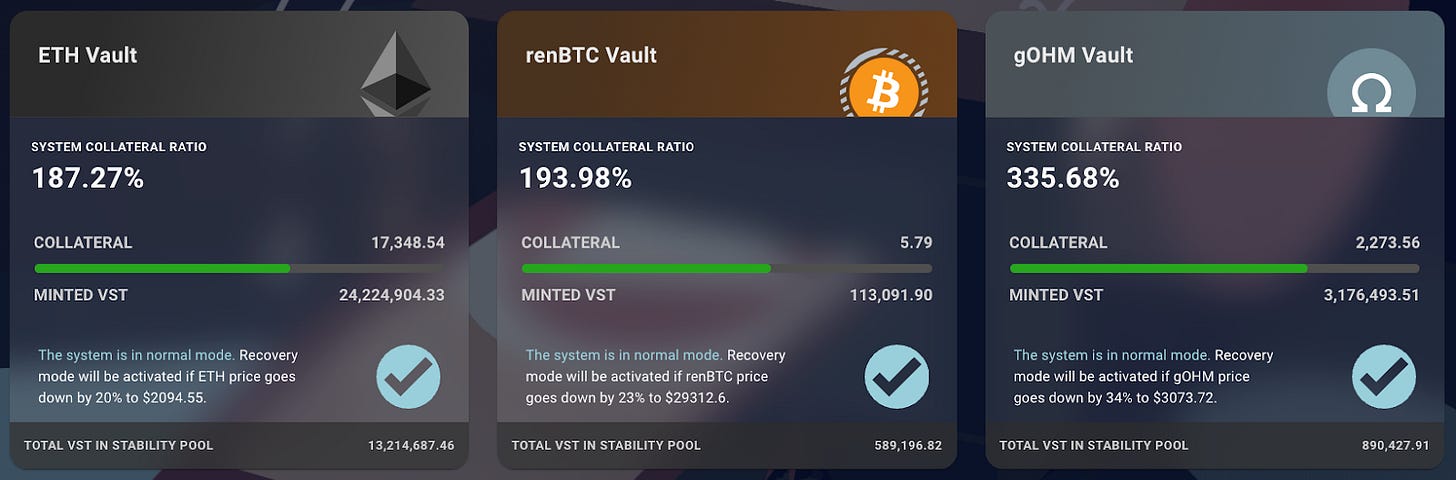 A variety of Vesta vaults are planned, starting with ETH, renBTC, and gOHM, with more to be added in the future. Each vault will have its own Stability pool.