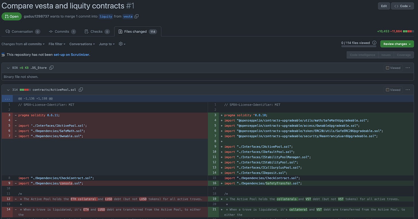 Vesta’s current technical implementation is largely based on Liquity. However, when comparing the two protocols closely, we find there are changes in the technical implementation of Vesta, with over 114 altered files. This has to be taken into account: while Liquidity is battle-tested and robustly audited (see here), this is not yet the case for Vesta.
