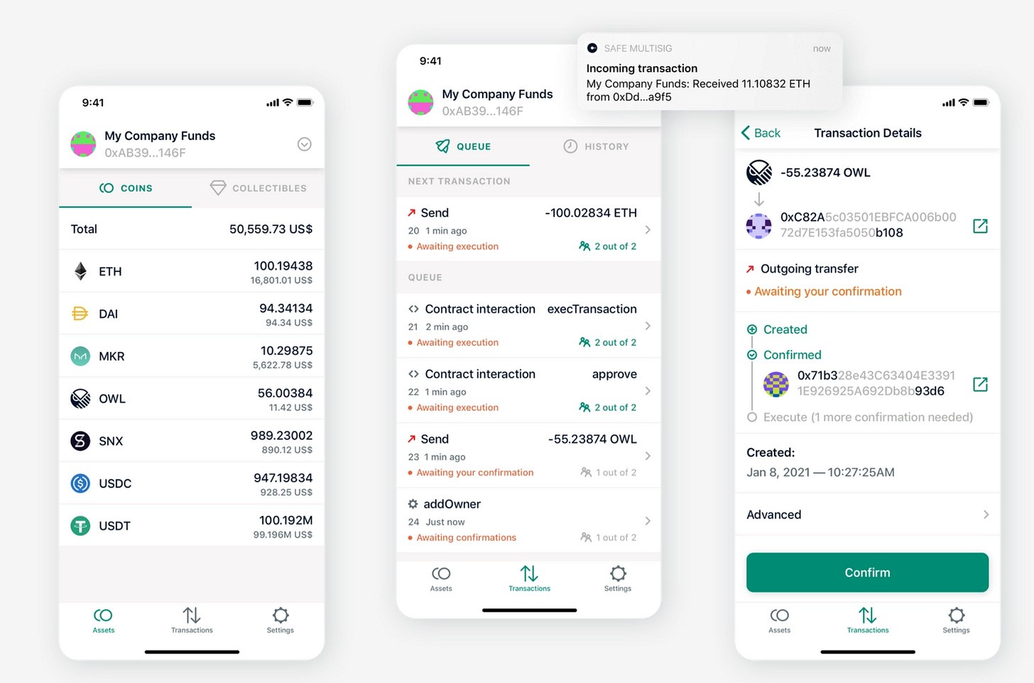 Multisig (or multi-signature) wallets offer the unique feature called multi-signature transactions. In practice, an on-chain transaction (on Ethereum, for example) can only be sent to the miner if more than one wallets approve and sign that transaction. This technology offers a myriad of use-cases, some of which are detailed in the following.