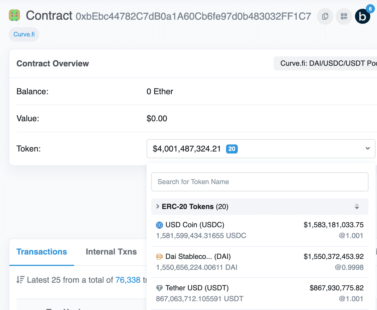 The Etherscan contract page for Curve.fi 3pool. The token breakdown of the pool can be accessed either from reading the contract or by viewing Etherscan directly.