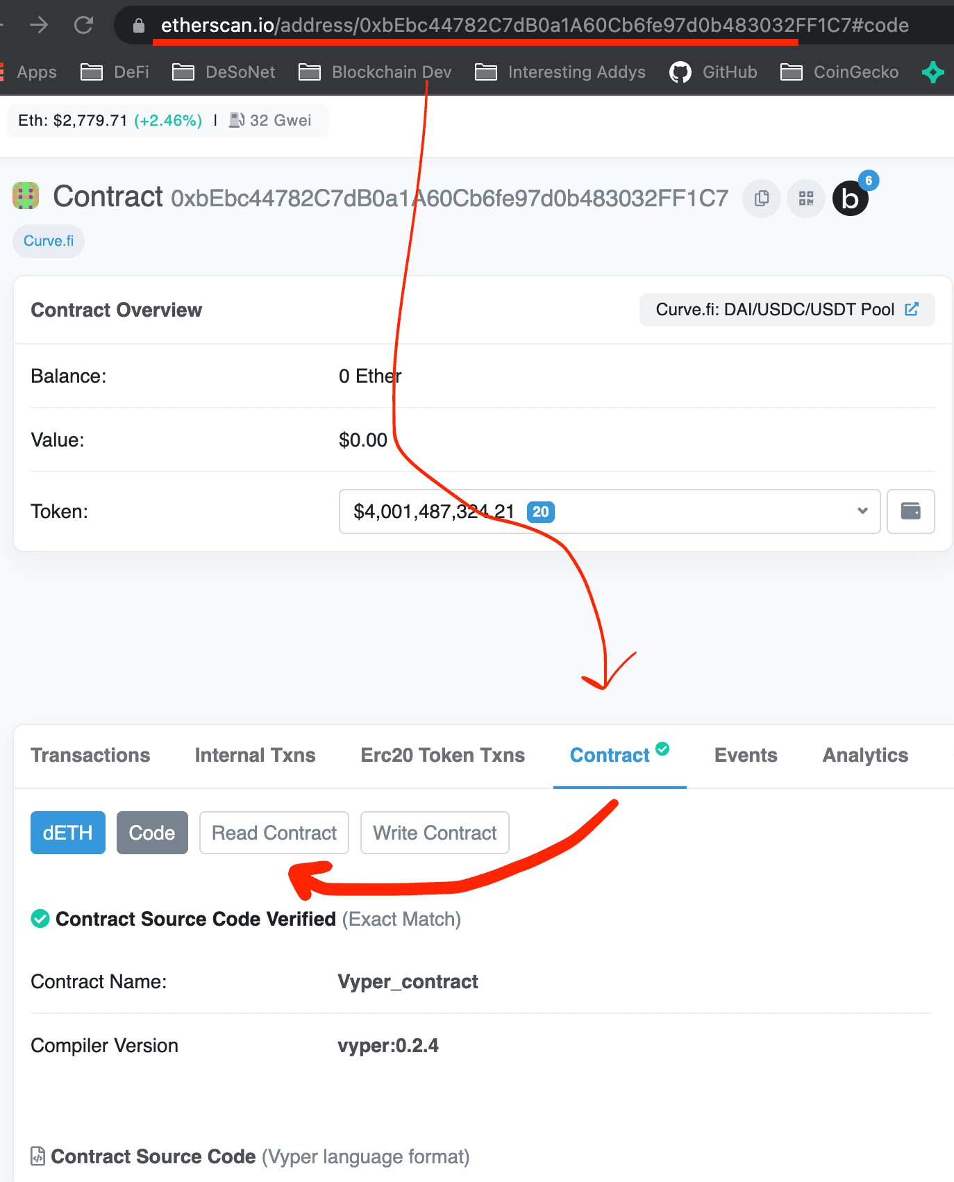 Let’s look at one of the most popular contracts in Decentralised Finance: Curve Finance’s 3pool contract. This is a liquidity pool that handles user funds and enables a specialised automated market maker for the three most popular dollar stablecoin assets: USDC (by Circle), USDT (by Tether) and DAI (by MakerDAO). These three stablecoins are behemoths in modern-day DeFi, and for some reason, enough people trust Curve’s 3pool contract to deposit a total of 4 billion of liquidity in it: