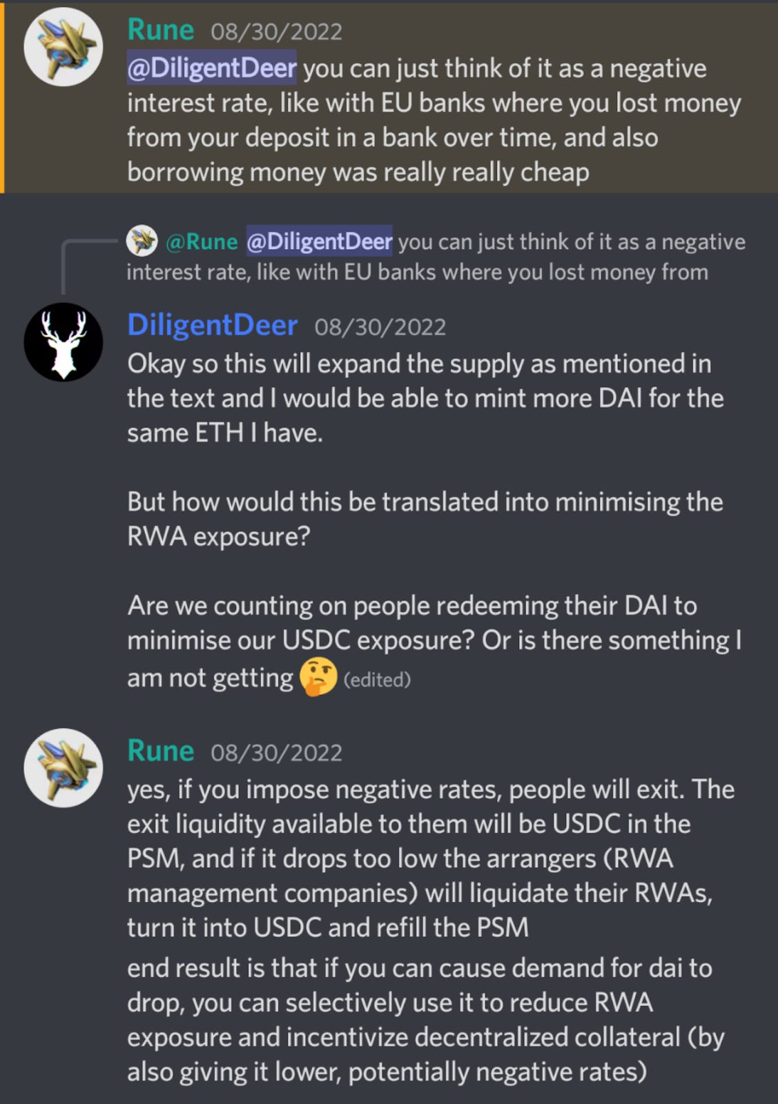 Rune believes the only way to guarantee a hard limit on RWA exposure is to allow $DAI to free float. If the excess $DAI demand is not catered to via decentralized collateral, imposing negative rates would be inevitable.