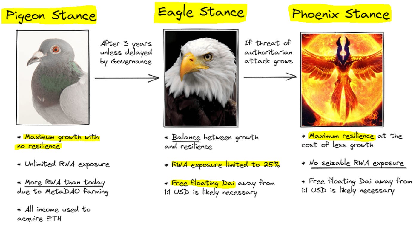 The overall multi-year strategy can be thought of as first focusing on “world currency” by prioritizing keeping the 1:1 USD peg and not putting a limit on RWA exposure, and then switching to focus on “unbiased” by allowing the peg to break and enforcing hard limits on RWA exposure.