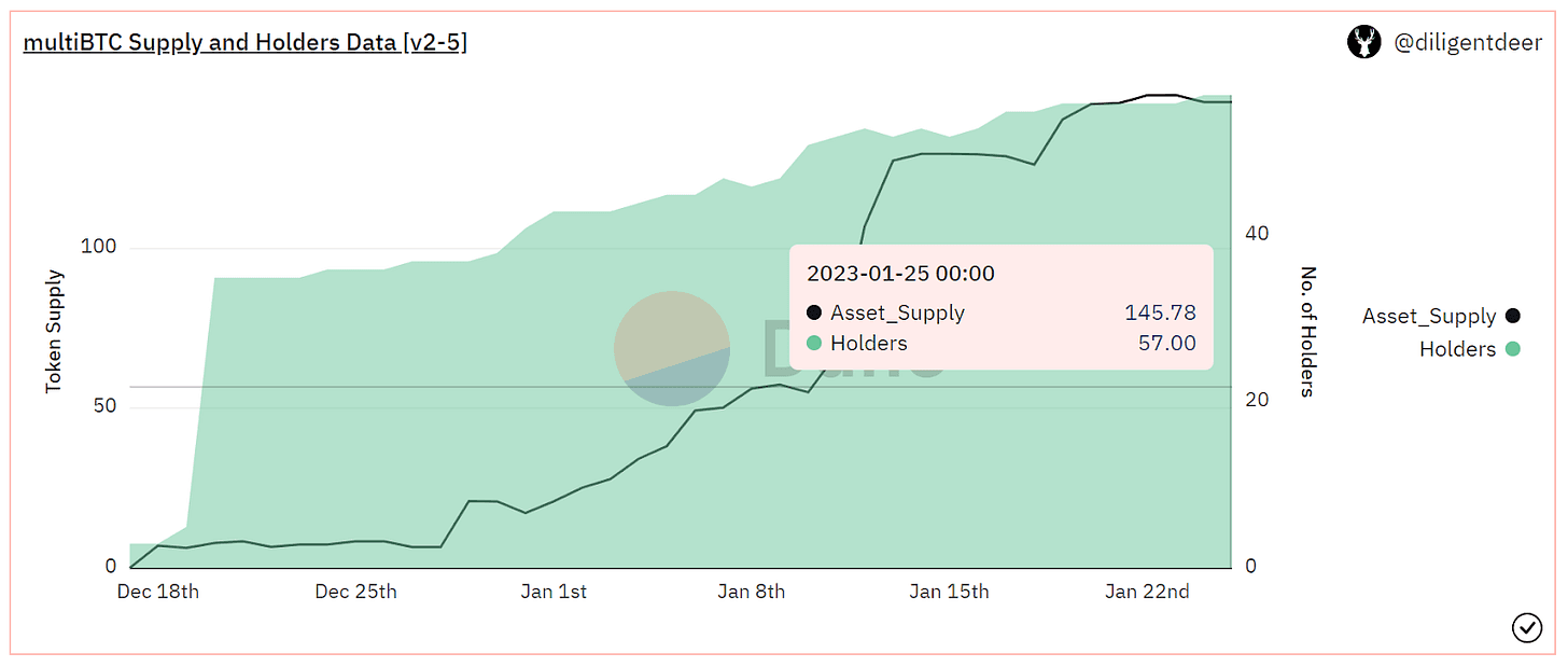 MultiBTC was created on December 16th, 2022 and the multiBTC-sBTC2 pool was successfully voted to add to the gauge controller (Vote). Multichain’s multiBTC is trying to capture demand for permisisonless BTC bridging that was created due to the deprecation of the Ren network.