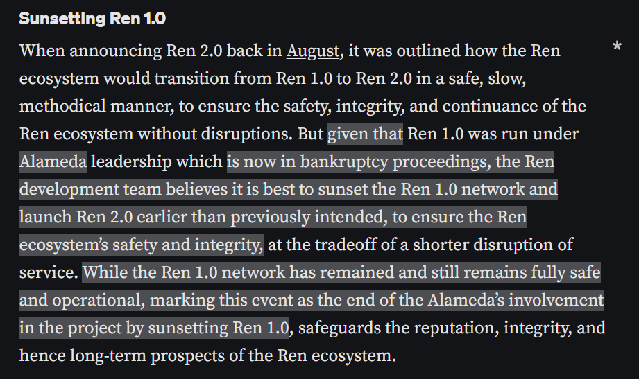 Ren team announced on November 19th, 2022 to sunset Ren 1.0 network as a result of the Alameda bankruptcy. They are asking all renBTC holders to redeem their BTC atRen bridge, as the bridge will soon cease operations.