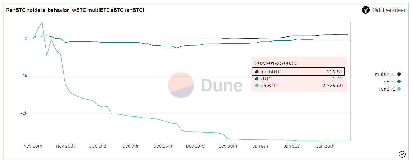 Before the announcement, renBTC supply was almost 2400 (18th November 2022). Since November 18th, 2729.6 renBTC have been burned (bridged back) and 421 renBTC are yet to be burned.