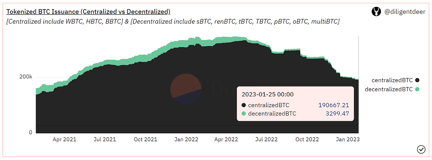 We consider whitelisted and custodial exchange tokens (WBTC, HBTC, BBTC) as centralized and crypto-backed or permissionless bridge tokens (sBTC, renBTC, tBTC, TBTC, pBTC, oBTC, multiBTC) as decentralized. The proportion increased from almost 92% centralized to 98.3% centralized between mid-May 2022 and January 2023. In the same period, the overall bridged BTC supply dropped 44%.