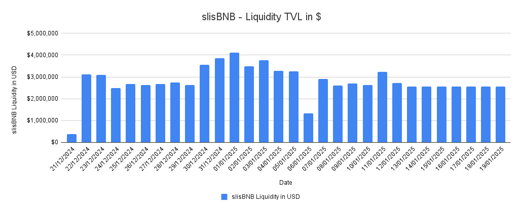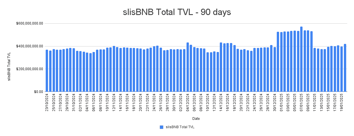 According to DefiLlama, as of January 23, 2025, asBNB holds approximately $64.33 million in Total Value Locked (TVL). The majority of this TVL (95.46%) is comprised of slisBNB, while only 4.54% consists of CAKE tokens.