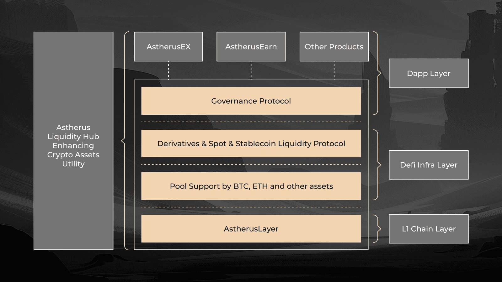 Astherus operates through a three-layer architecture that integrates user-facing applications, DeFi infrastructure, and blockchain technology to deliver a comprehensive ecosystem for digital asset management and yield generation.