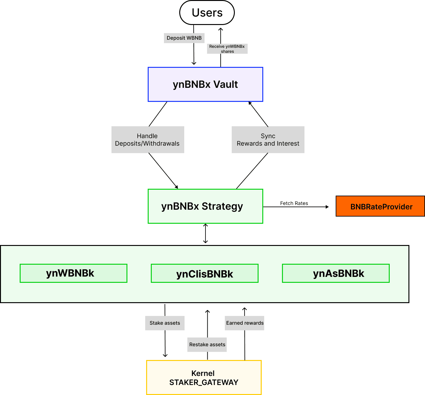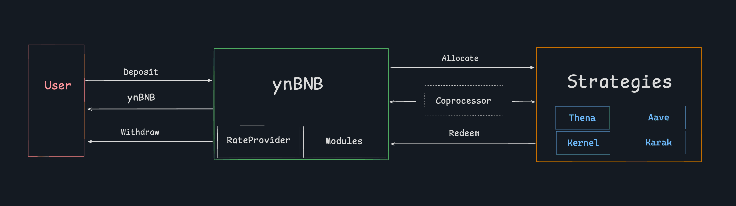 The user deposits ERC20 wBNB or its derivatives as base underlying assets into the ynBNBx MAX LRT and, in return, receives share tokens denominated in a major base asset (wBNB in this case). On the operational side, internal modules like the RateProvider are used to determine accurate pricing and conversions, while a Coprocessor helps manage asset allocation and strategy execution. At present, ynBNBx MAX primarily allocates deposited assets into the Kernel restaking strategy.