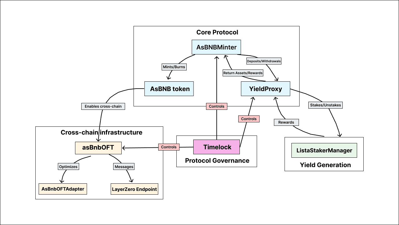 AsBNB is the ERC20 yield-bearing BNB derivative that provides essential functionalities such as token standardization, ownership control, and gasless transactions (ERC20 OpenZeppelin). The contract allows only a designated minter to mint or burn AsBNB, ensuring controlled issuance and removal of tokens. The owner of the contract has the ability to update the minter via the setMinter function.