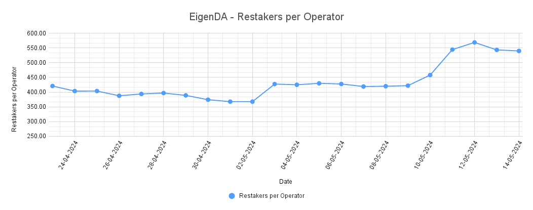 Conversely, a lower value of restakers per operator suggests a more evenly distributed delegation of restaked ETH across multiple operators, which is generally desirable for decentralization.