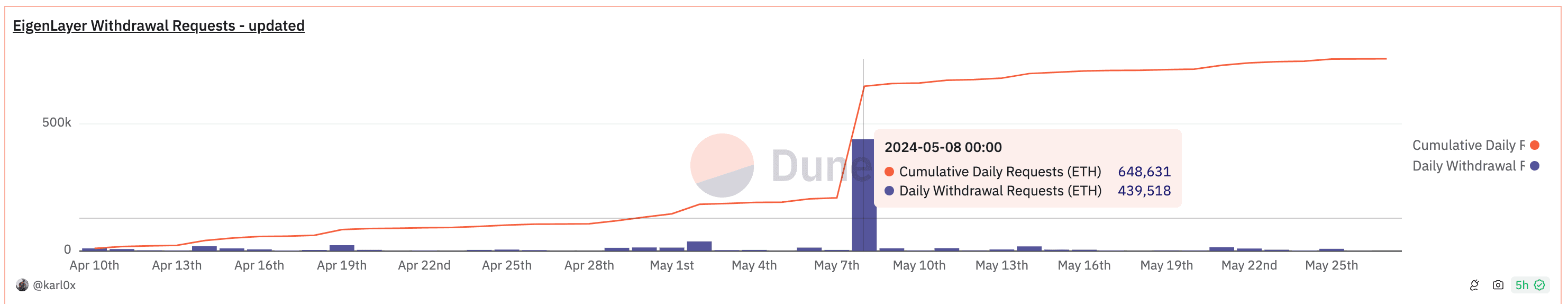 This Dune Dashboard shows withdrawal requests from EigenLayer. The EIGEN distribution announcement took place on April 29, 2024 with a snapshot taken on March 15, 2024. We can see that there were modest withdrawal requests immediately following the announcement. A large 450k ETH uptick on May 8th has been associated with Puffer Finance migrating operations with the intention to natively restake the capital, as mentioned here.