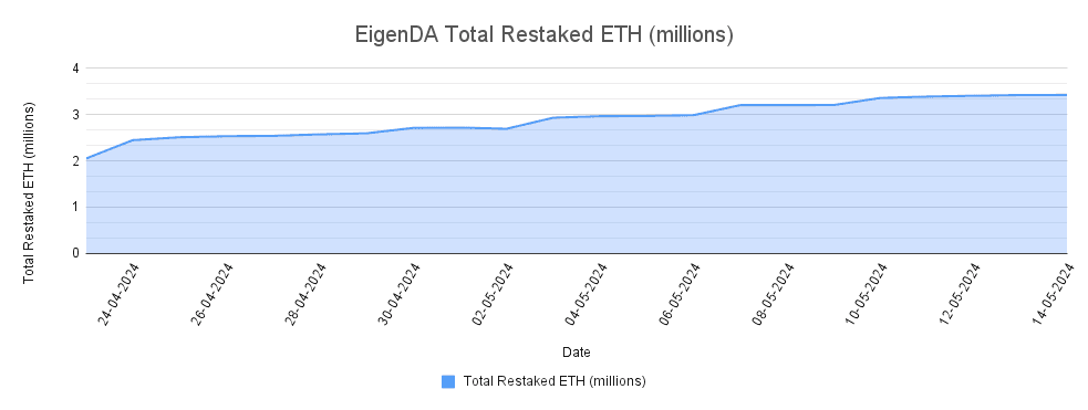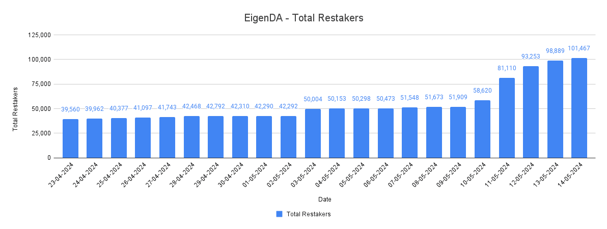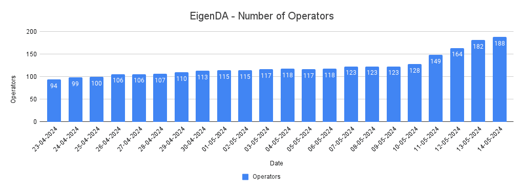 Despite the rapid growth observed in recent months, restakers are urged to exercise considerable caution in a prospective engagement with EigenDA. This caution is justified by the high degree of centralization in its operations and the overall system's relative immaturity (as is the case with EigenLayer generally).