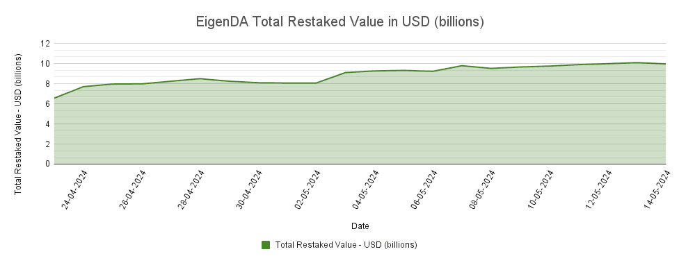 Below, we provide two charts showing EigenDA's total restaked assets in ETH and USD: