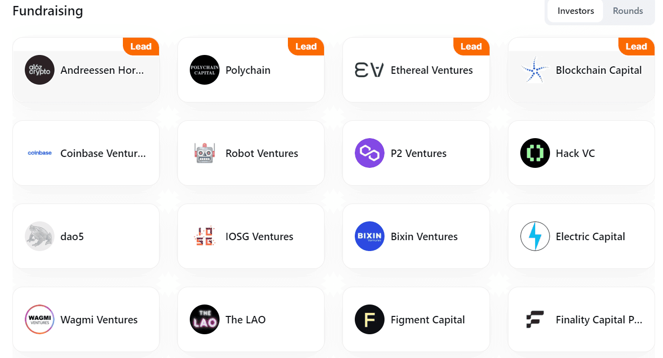 In March 2023, EigenLayer successfully closed a Series A funding round, securing $50M on top of $14.5M collected in Seed round. Following the deployment on a testnet, the project further raised $100M in a Series B round in February 2024. The long list of investors in Eigen Labs is headed by a16z Crypto & Blockchain Capital. Polychain Capital and Ethereal Ventures are also positioned as lead investors.