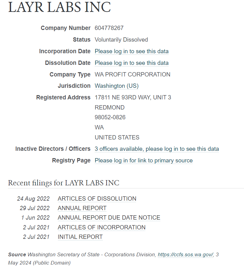 Layr Labs Inc. is now defunct according to the OpenCorporate query below. The entity is reported voluntarily dissolved as per public data retrieved from the Washington Secretary of State - Corporations Division.