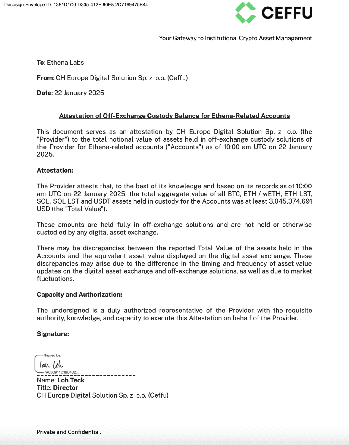 Custodians’ roles in administering their Off-Exchange settlement products include both the safe custody of assets and the enforcement of the terms of the Off-Exchange settlement legal agreement. This means that, in the event of an erroneous settlement request from an exchange or an insolvency event at the exchange, the Off-Exchange settlement provider will enforce the underpinning legal agreement both operationally and technically. Based on the information at hand, we have every reason to believe that Ethena not only keeps its USDe backing assets out of centralized exchanges but also adheres to best security practices in its arrangements with custodians.