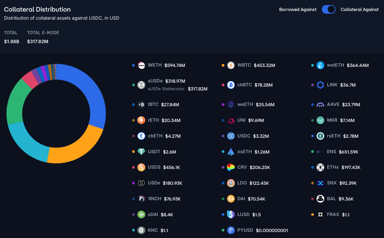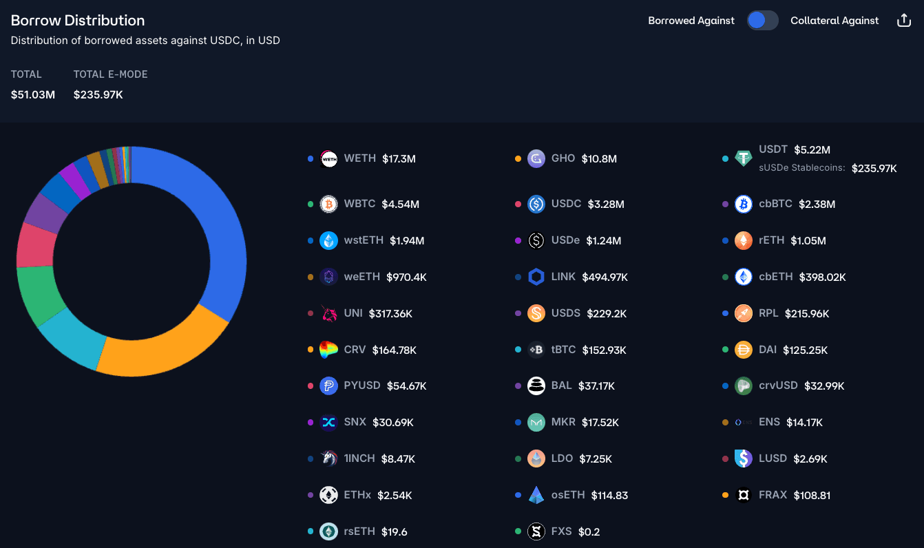 WETH dominates the borrowing activity against USDC collateral on Aave, as shown below:
