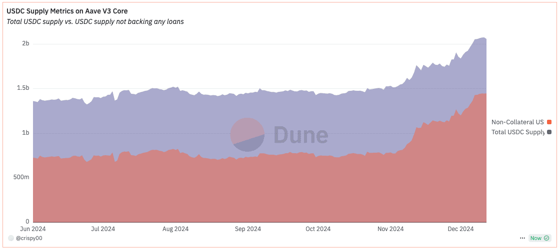The total USDC supply on Aave shows that most users provide liquidity to earn supply APY rather than using it as collateral. The increase in non-collateralized supply coincides with 15-18% competitive yields. This suggests users are moving funds from lower-yield venues to capture these rates. The timing of increased USDC supply aligns with Coinbase's USDC rewards program ending, though a direct correlation cannot be confirmed.