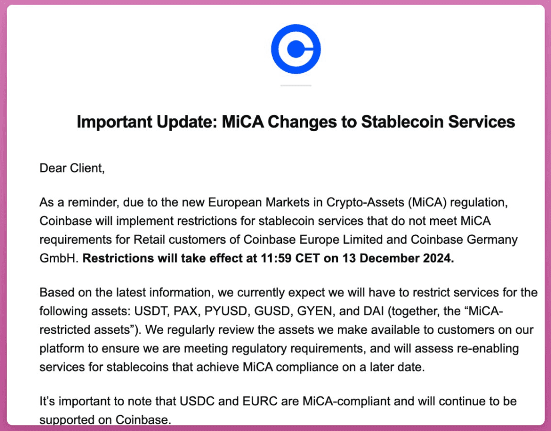 In a second phase of MiCA compliance, Coinbase announced further restrictions affecting several stablecoins. Starting December 13, 2024, retail users will lose access to USDT (Tether), PAX (Pax Dollar), PYUSD (PayPal USD), GUSD (Gemini Dollar), GYEN, and DAI on Coinbase's platform. Only USDC and EURC remain unaffected, having already achieved compliance status. Coinbase has indicated they may reinstate services for certain stablecoins if they achieve MiCA compliance.