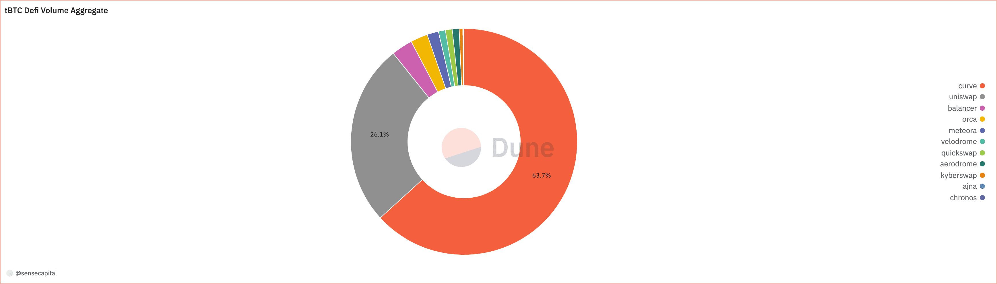 tBTC DEX presence has increased since the initial analysis. At the time of our original report, tBTC had a presence across various DEX pools, including Curve, Uniswap V3, Balancer, Velodrome, Aerodrome, and Orca, with the heaviest concentration on Ethereum-based Curve pools. As of this addendum, the main liquidity venue remains Curve, although Uniswap V3's tBTC/WTBC pool has grown in use.