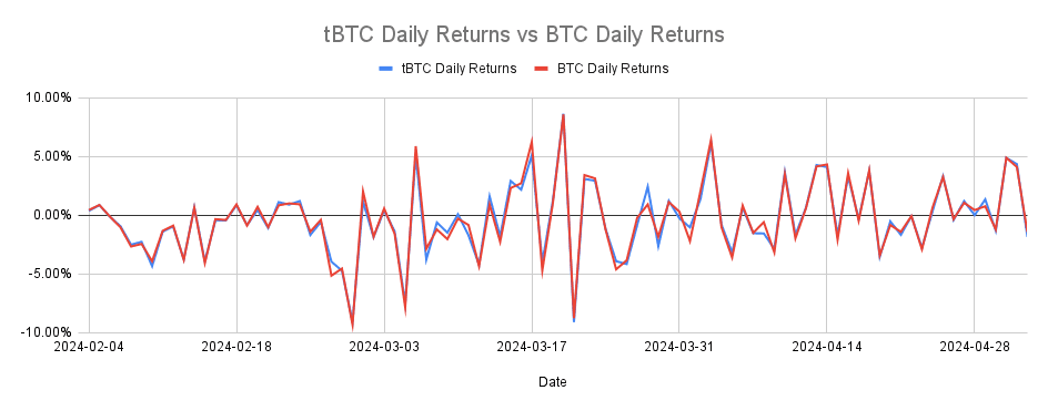 Below is a graph of the daily returns of tBTC relative to spot market BTC over 90 days. Daily returns calculate the difference between the closing price of an asset on one day and the closing price on the previous day. Average daily returns assess the volatility of an asset over time.