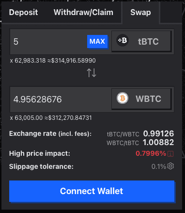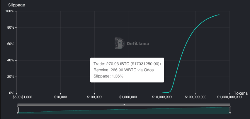 Since the initial report, slippage has remained relatively the same, with a trade of 270.93 tBTC resulting in 1.36% trade slippage for 266.90 WBTC as of May 13th, 2024.