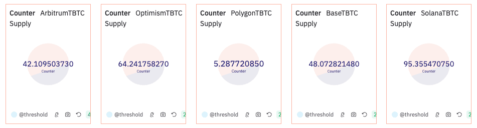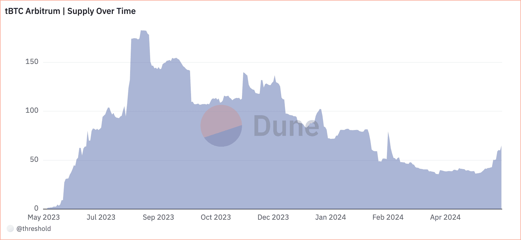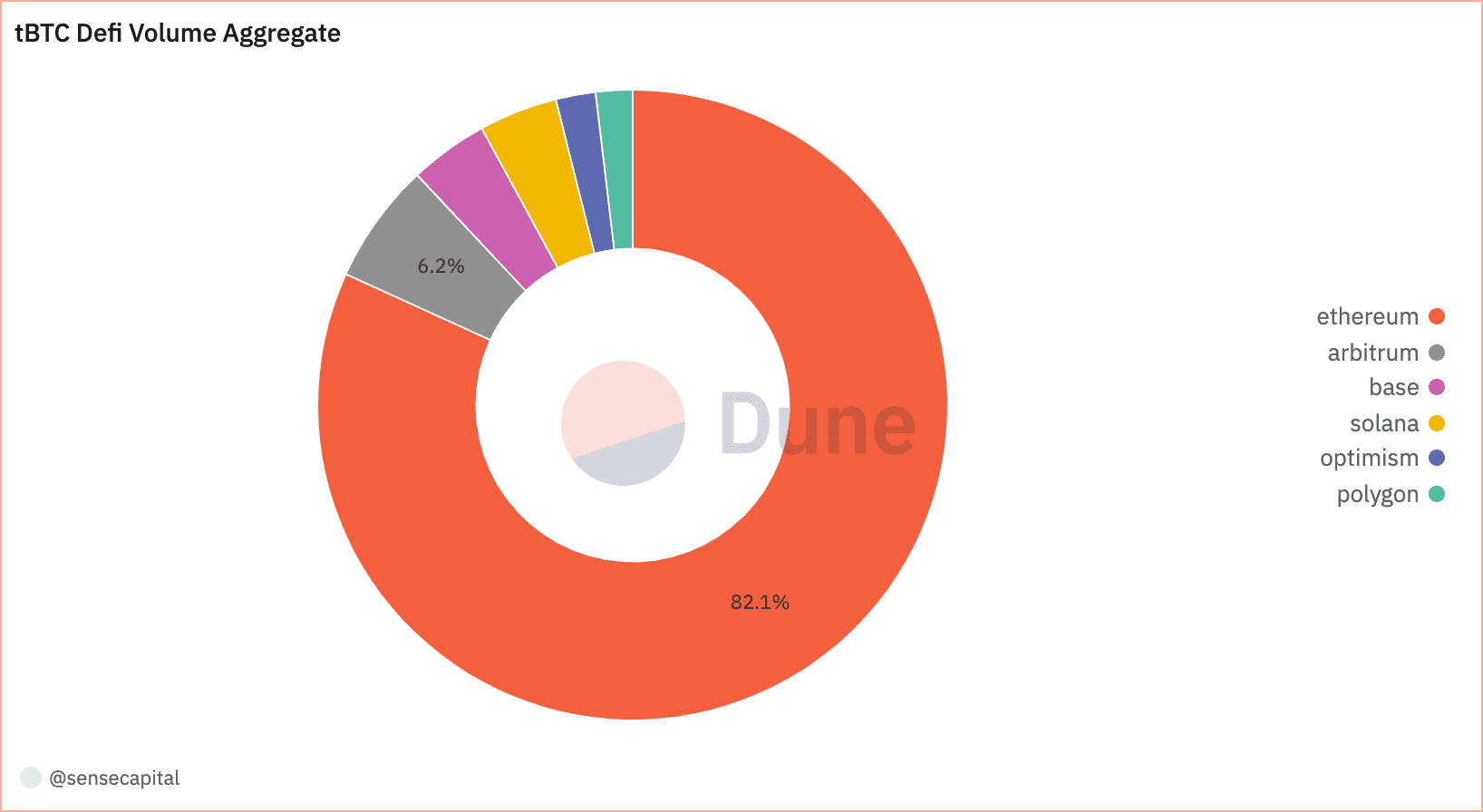 Most tBTC remains the Ethereum mainnet, with marginal adoption on Arbitrum, Optimism, Polygon, Base, and Solana.
