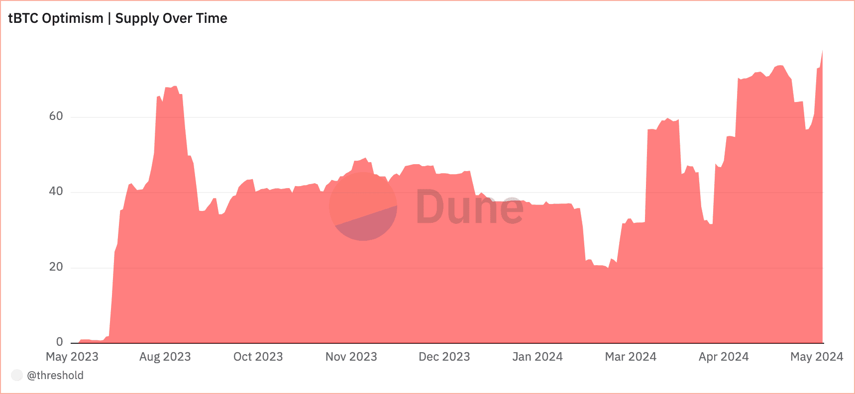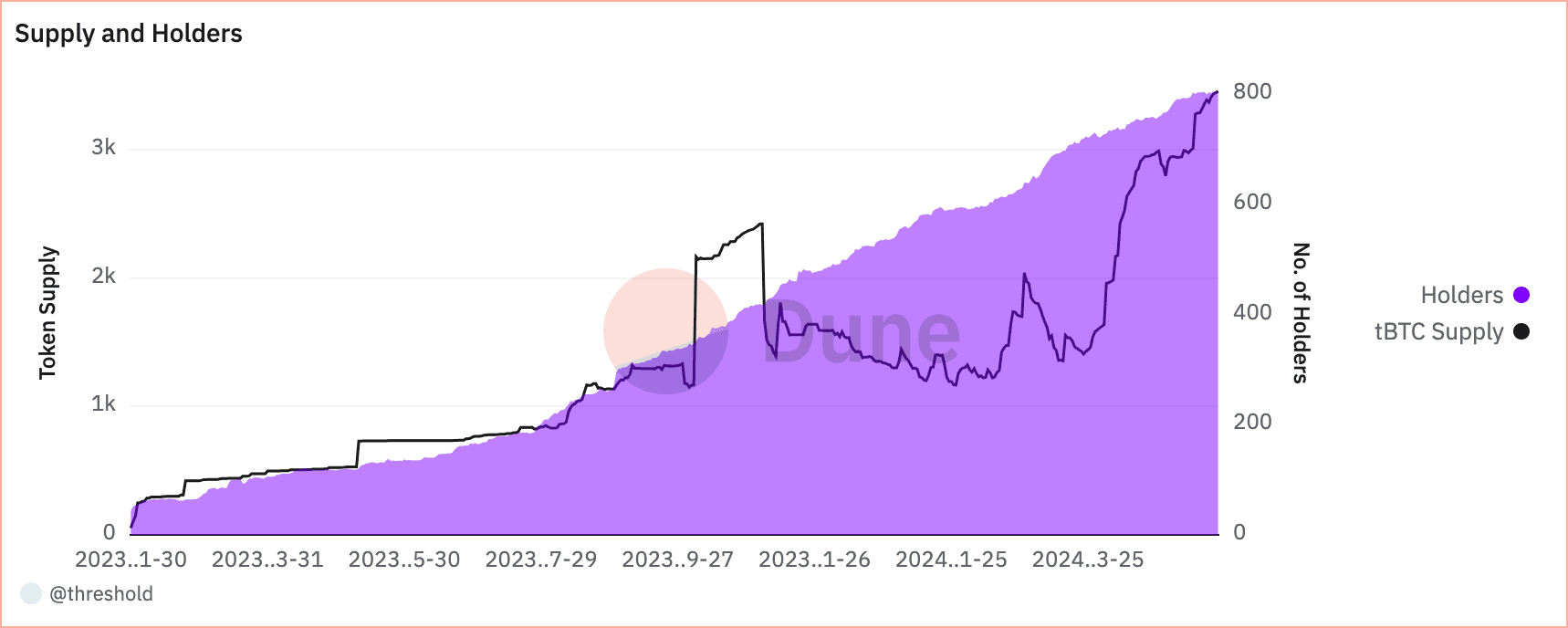 tBTC has experienced periods of sharp volatility in the token supply since our original report. TVL saw a pullback from November until early April, when supply surged. The supply is currently at an all-time high, at over 3,285 tBTC as of May 13th, 2024.