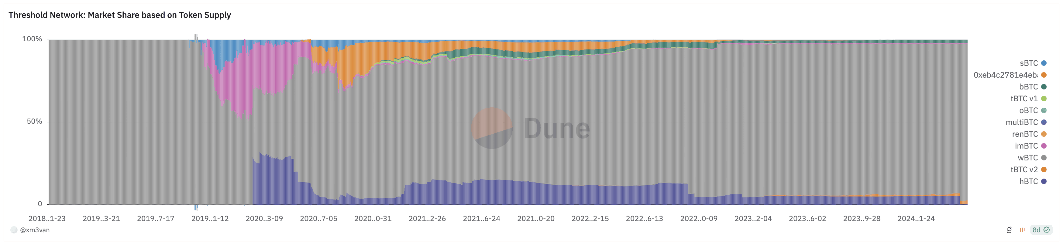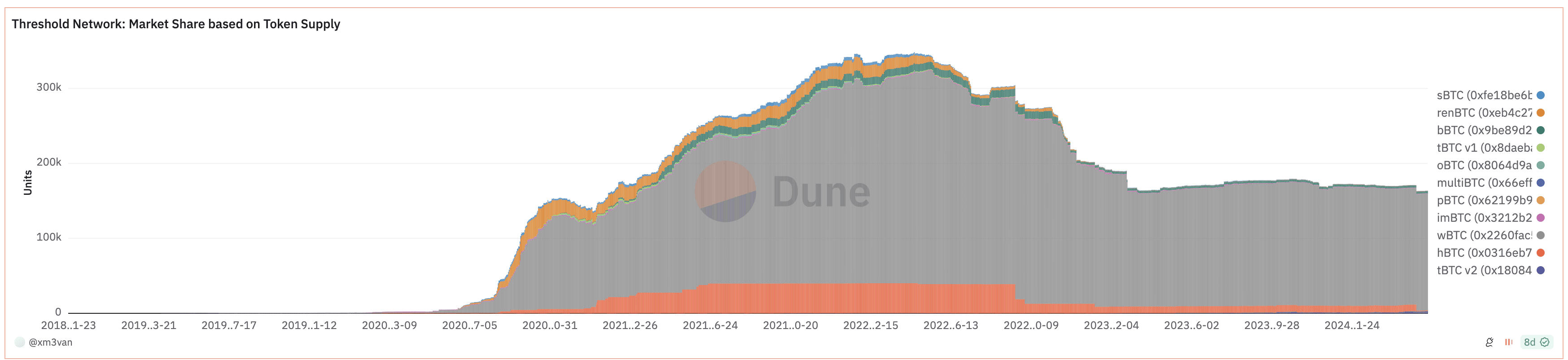 tBTC remains a small subset of tokenized BTC on Ethereum, with ~2% of the overall market share. The overall BTC market on Ethereum has stagnated since our original report.