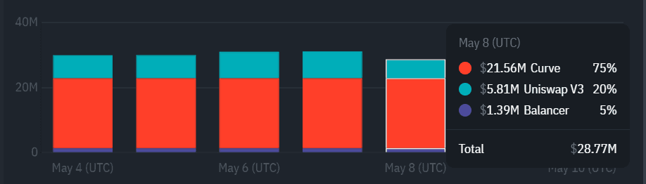 According to Dex Guru, liquidity distribution has diversified slightly over seven days (April 4th, 2024 - May 2nd, 2024) 5 days saw an average distribution ratio of Curve 76%: Uniswap 17%: Balancer 5%. The remaining 2 days presented a more narrow split between Curve 94% and Balancer 6%.