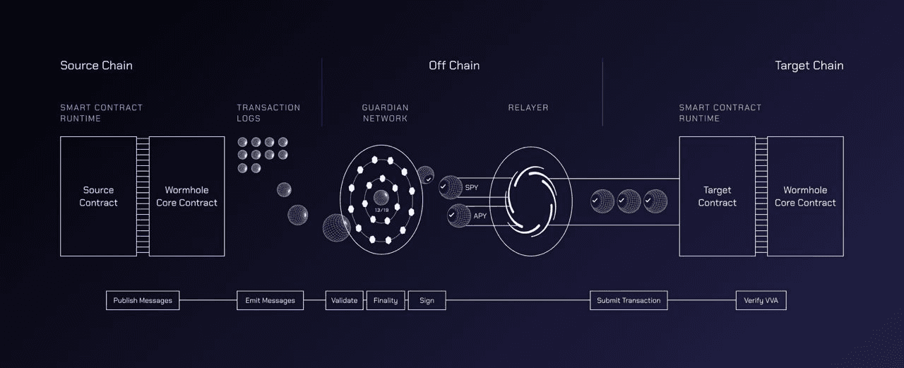 The Wormhole network relies on a distributed set of nodes called Guardians to verify and relay cross-chain messages. These Guardians observe the state of various blockchains and sign corresponding payloads, combined to form a multisignature proof known as a Verifiable Action Approval (VAA). This VAA attests that most of the Wormhole network has observed and agreed upon a specific state.