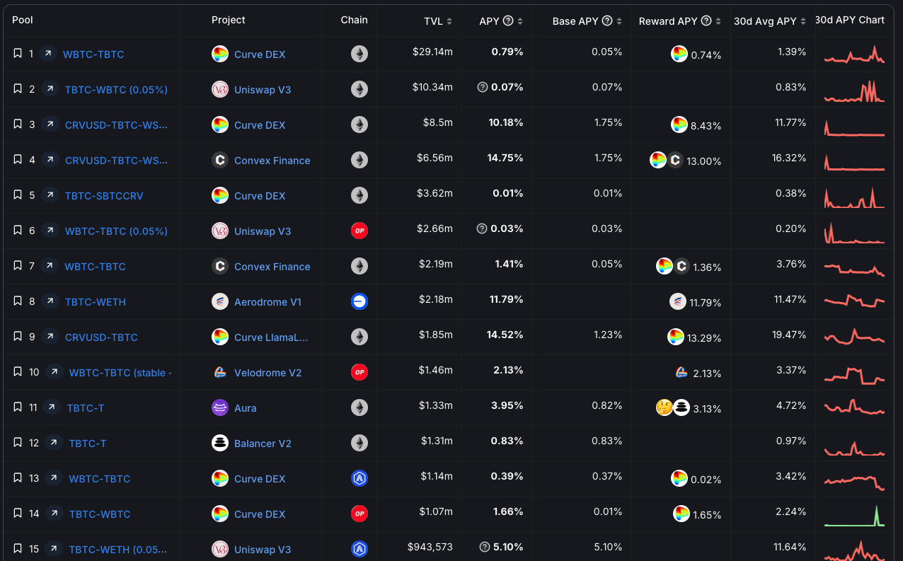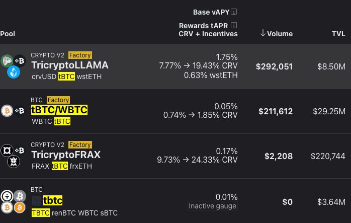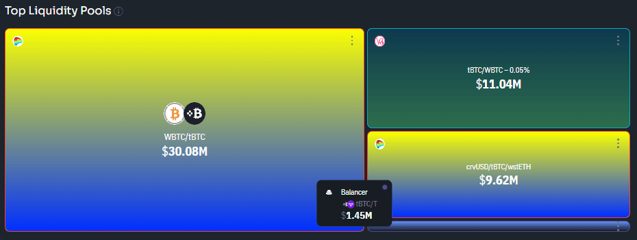 Curve pool liquidity is concentrated in the tBTC/WBTC stableswap pool and crvUSD/tBTC/wstETH TriCrypto pool.
