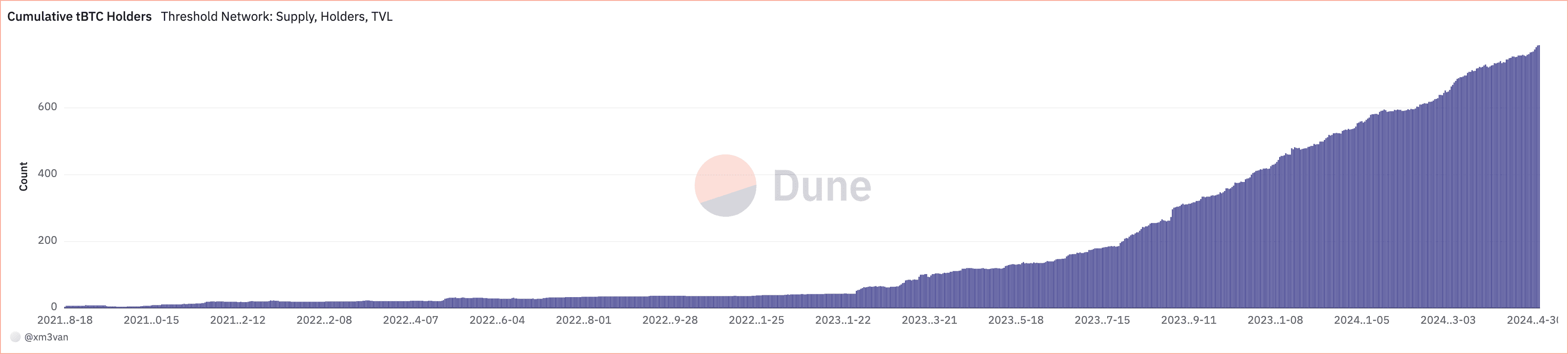 tBTC has seen meaningful user growth, with the number of unique holders increasing from ~400 as of our original report to nearly 800. This figure has continued to climb even as the overall tBTC TVL has experienced volatility to the downside between November and April.