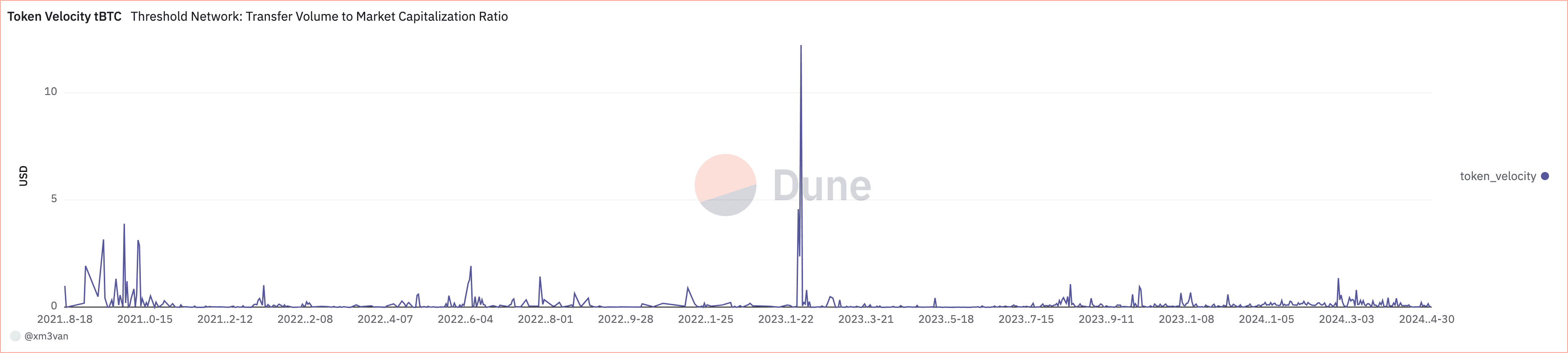 The chart below depicts the Token Velocity of tBTC for a 90-day interval (i.e., Token Velocity = Daily Transaction Volume / Average 90-day Market Capitalization).