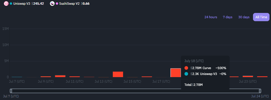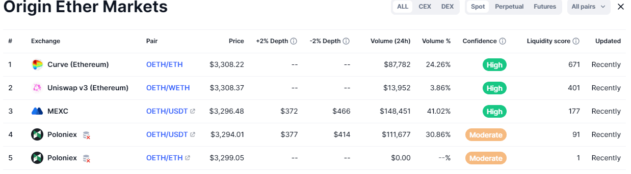 OETH liquidity still remains predominantly on Curve, with the AMO playing an important role in its liquidity management and additional revenue generation. This trade off, as previously noted, increases reliance on a single DEX for liquidity. The addition of 2 centralized exchanges improves the initial low market depth with consistent daily volume going through these CEXs (e.g. MEXC and Poloniex handled >70% 24h market volume on July 27).