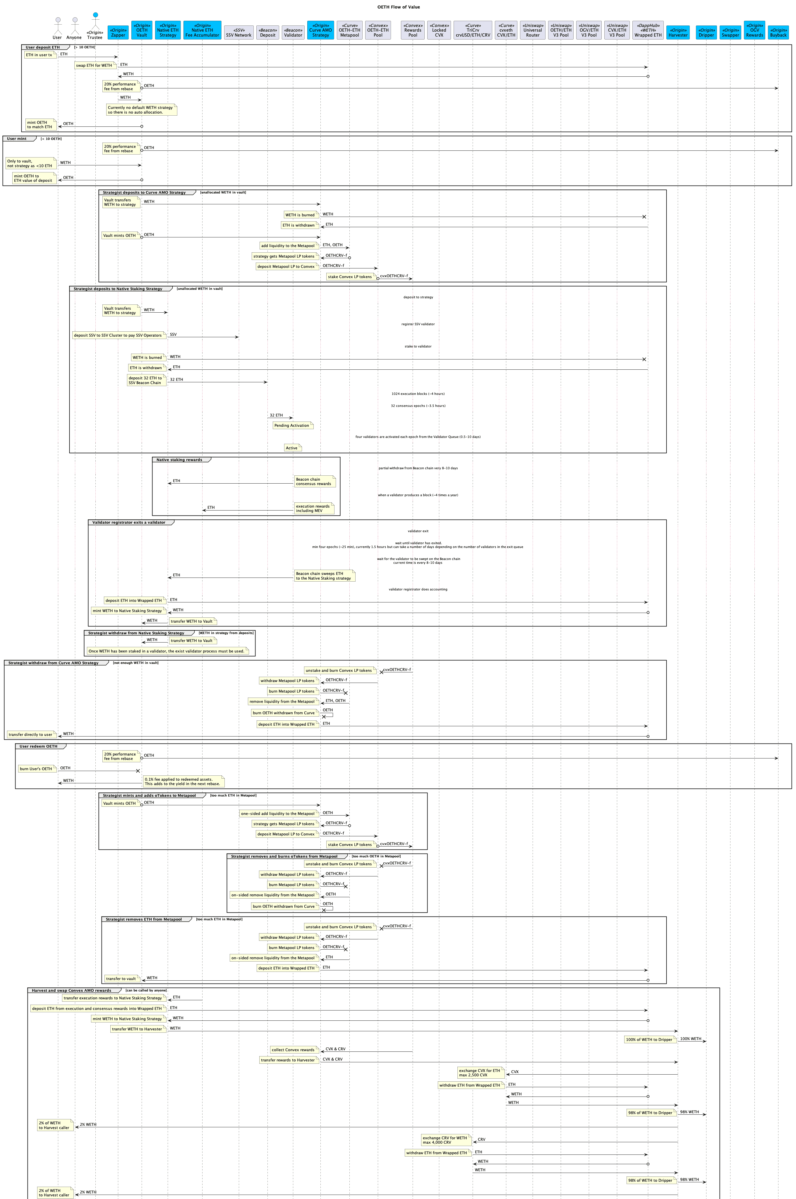 The following diagram shows the current overall value flow within the OETH system since the design change. See the Origin GitHub for a further breakdown of each category within the value flow.