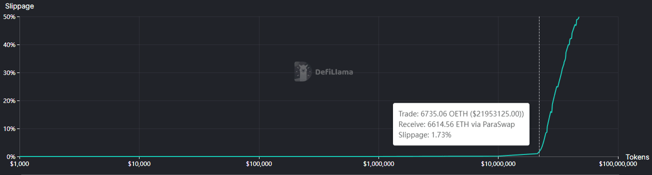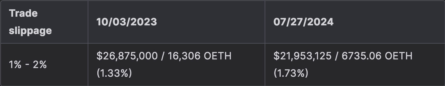 Price resistance has declined slightly, with more marginal slippage being affected by a lower dollar value and quantity of OETH.