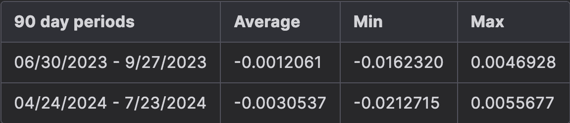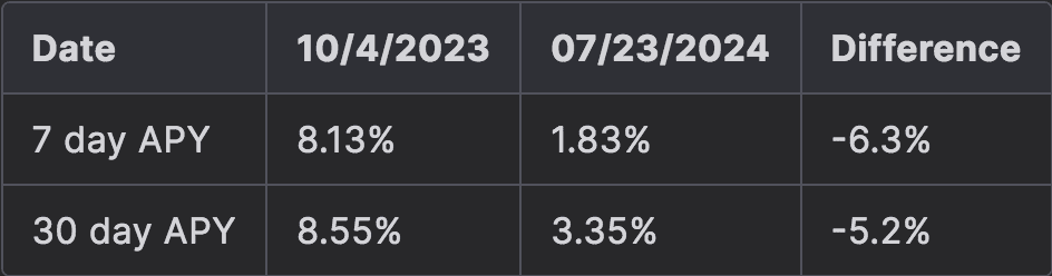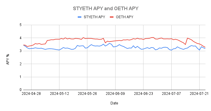 At the time of writing, the ARM is currently under development. This product is currently in its early stages and is intended to offer zero slippage swaps for OETH and other redeemable assets (1:1 exchange rate). As it has yet to be fully implemented within OETH, a brief description of the product and its implementation results will only be presented here. Billed as a ‘cross between an AMM and an isolated money market’, asset prices are benchmarked against lending rates (in this case ETH) used on money markets such as Aave rather than pricing using a bonding curve. This presents an alternative scenario where LST holders have more capital-efficient avenues to instantly redeem for ETH instead of waiting for redemption queues (unstaking periods) or accepting less ETH through traditional AMM (e.g. varying curves and slippage for larger swaps). Over the last 12 months (from 07/22/2024) average borrow APY for ETH on Aave V3 is 2.60%.