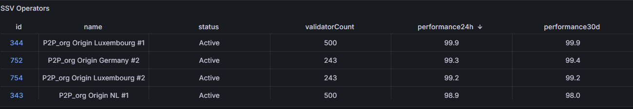 Origin currently uses Permissioned Operators from P2P, a professional staking service provider (2.25% of total ETH stake). As the sole cluster operator, P2P supports various liquid staking protocols across multiple blockchains. 30-day operator performances range between 98% - 99%.