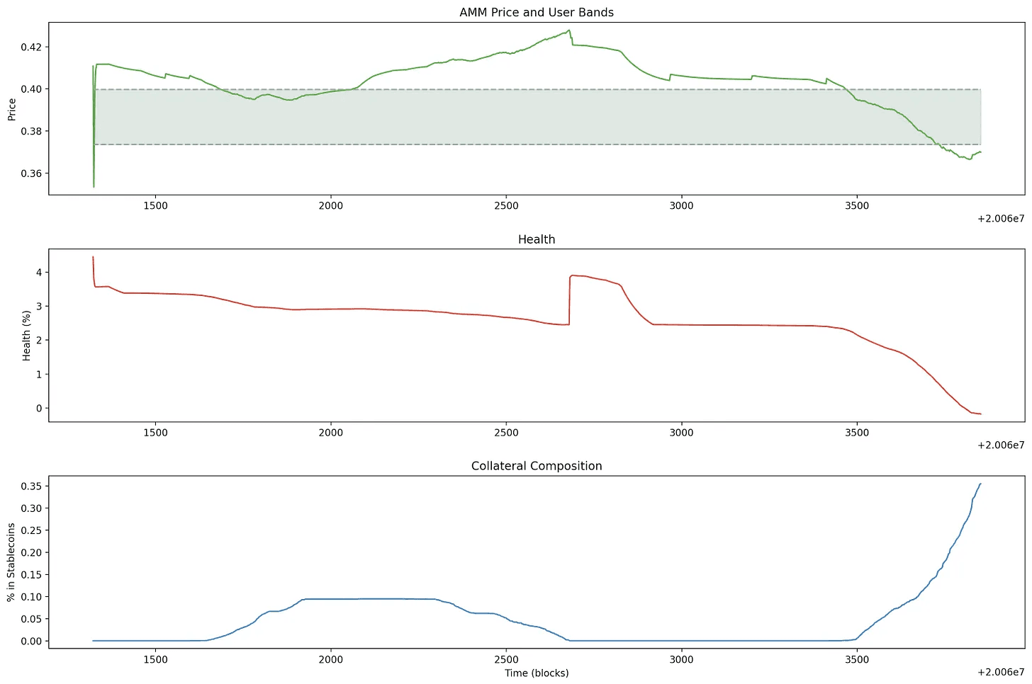Note, however, that due to the soft-liquidation design, the worst scenario would be if the CRV price increased rapidly. In the LLAMMA soft liquidation algorithm, position healths erode by incentivizing arbitrageurs to swap between the collateral and debt token at a cost to the borrower. If CRV increased in price, the position would become fully exposed to CRV and simultaneously drop in health, potentially resulting in a hard liquidation of the full 23.6m CRV collateral amount. In actuality, the price declined, the soft liquidation mechanism began transitioning exposure to crvUSD, and finally, hard liquidation occurred.