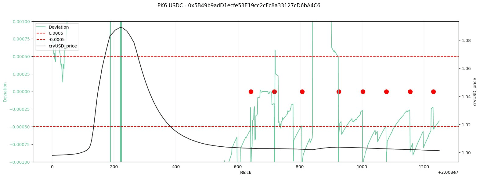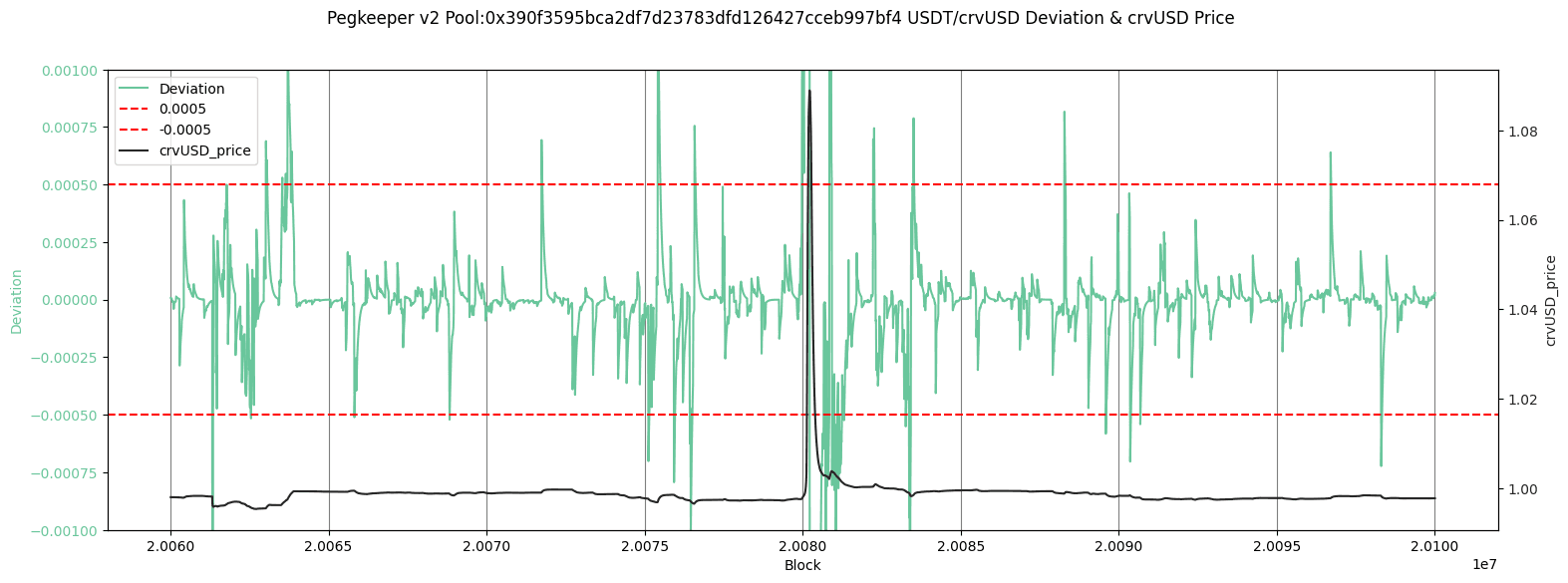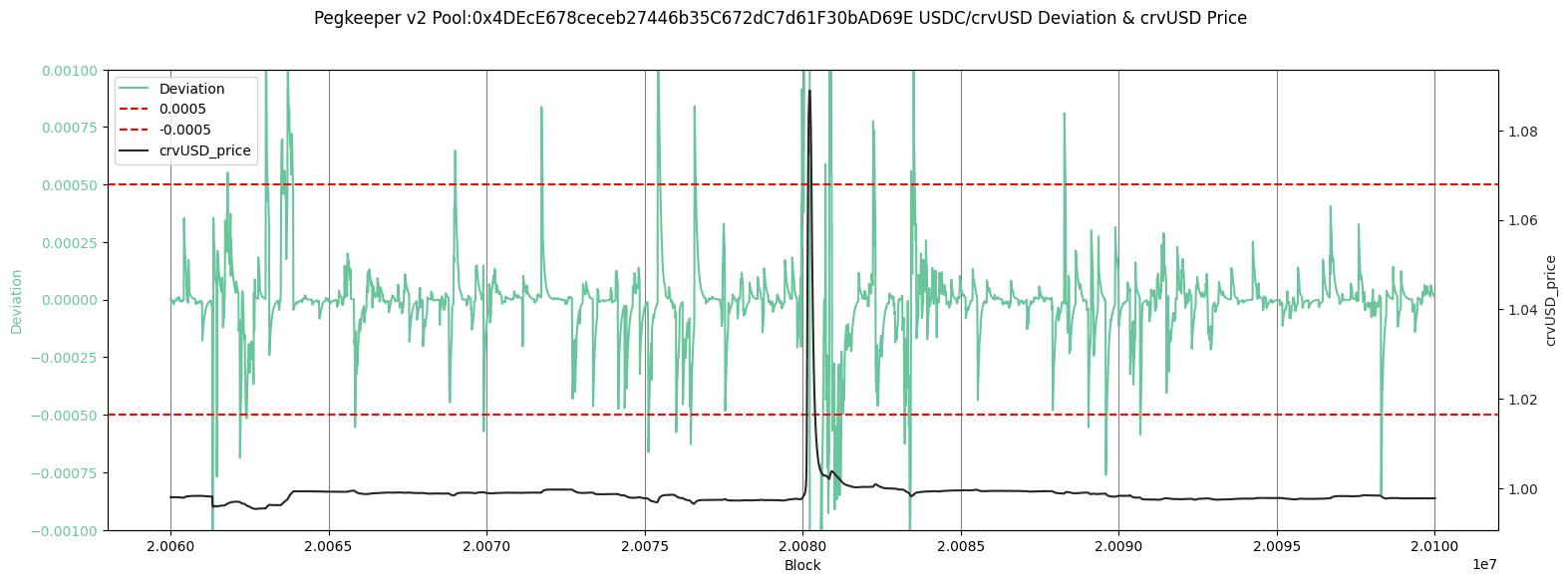 Since the Pegkeeper was not active at a time when conditions certainly merited it, we provide an analysis of the checks that are made before providing. Following is the crvUSD price trend and price deviation check for the above-discussed Pegkeepers. When the deviation exceeds the +/- 0.0005 bands, Pegkeeper updates will revert.