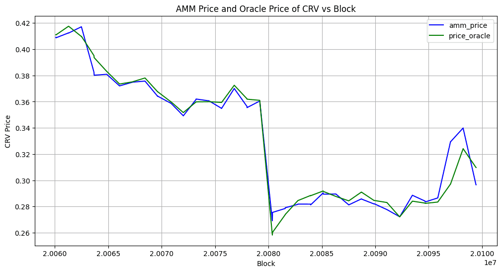 Here is a more precise view of CRV price during the event. It shows the CRV-long market AMM price against the market EMA pool oracle price.